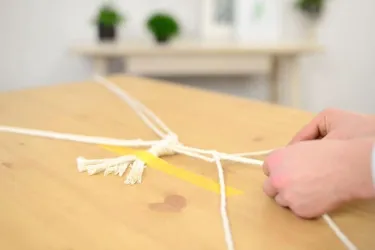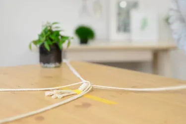 Зафиксируйте веревку на столе, используя клекую ленту, и свяжите куски веревки в пары.