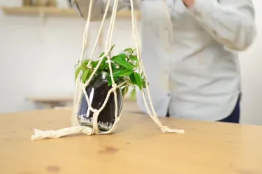 Зафиксируйте банку с растением в центре кашпо и соедините концы вереки вместе. Убедитесь, что банка стоит ровно. Завяжите верхние концы веревки посередине и закрепите их на крючке или кольце. Теперь завяжите концы веревки в один большо узел.