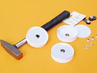 Достаньте диск-вставку из крышки и сделайте отвертстие для люверса с помощью специального инструмента для люверсов (чтобы это сделать, прочитайте инструкции на обратной стороне упаковки инструмента).